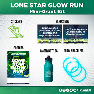 The Lone Star Glow Run is a youth-led event that turns tobacco prevention into a glowing celebration of health. This kit gives youth groups everything they need to host an evening or night-time fun run where participants light up the course with glow bracelets, neon accessories, and Texas-sized energy.