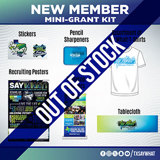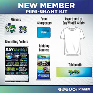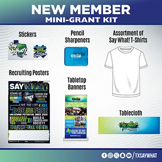 Is your youth group new to Say What! or are you ready to form your own club? This new member kit comes loaded with everything you need to launch your group and start advocating for tobacco-free lives. Inside you will find Say What! t-shirts, stickers, and pencil sharpeners to share, along with recruiting posters to help your club grow. To make your club look official at school or community events, the kit also includes a Say What! tabletop banner and tablecloth. This kit is only available for new members.