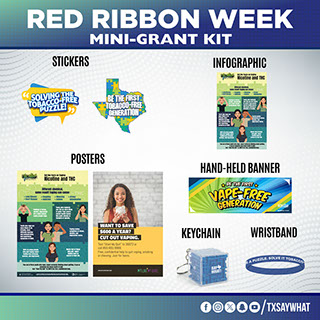 Red Ribbon Week is the perfect time to show that every choice matters in creating a tobacco-free future! The Piece by Piece: Solving Life Tobacco-Free Kit gives you everything you need to host a fun, interactive pledge activity at your school. Students will design their own puzzle pieces with personal tobacco-free commitments and add them to a pledge wall that comes together piece by piece. Each kit also includes infographics, wristbands, keychains, handheld banners and stickers to celebrate being tobacco-free!